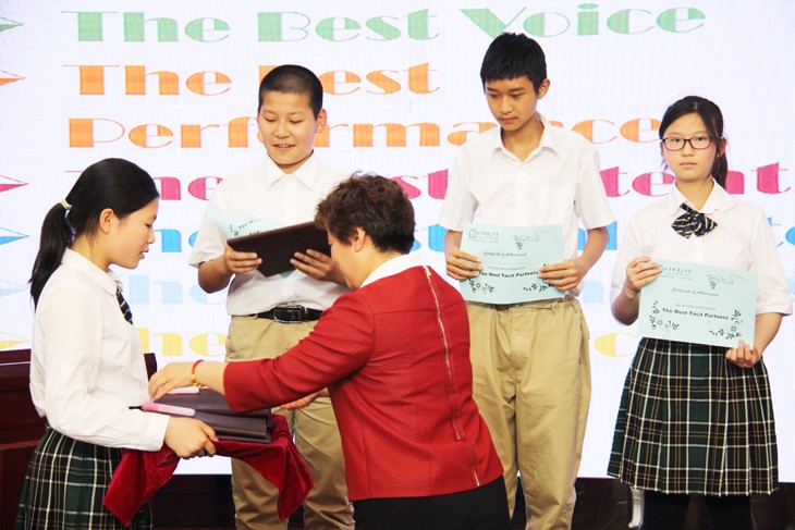 Instead of an intense competition, this activity is expected to provide students with a free stage to fully show their talents and creations. As a result, teachers designed different kinds of awards after careful consideration. They are the best voice, the best performance, the most talented, the most potential, the most photogenic and the most tacit partners. Therefore, all performers got their own personalized prize.